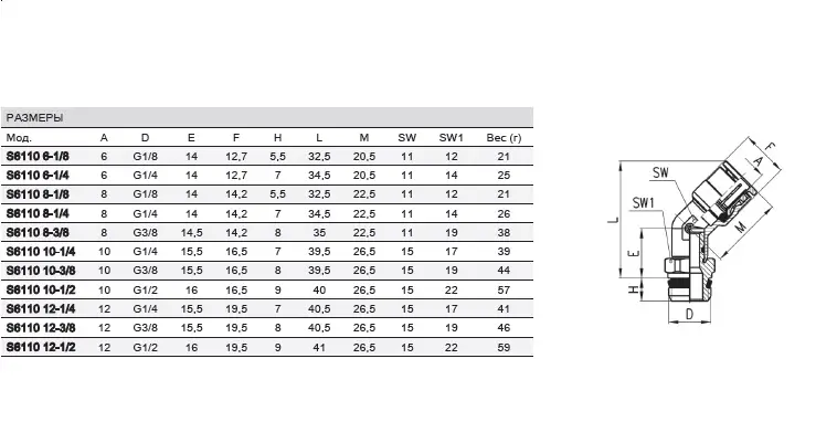 | Різьба | 1/8, 1/4, 3/8, 1/2, 3/4, М5, М6, М12х1,25 |