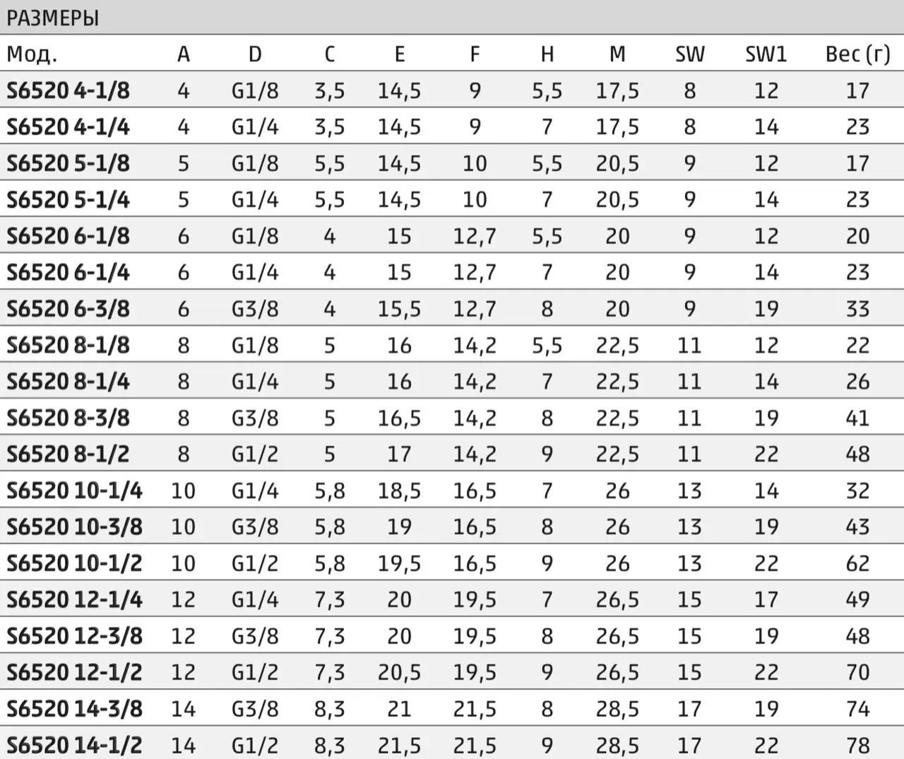 | Різьба | 1/8, 1/4, 3/8, 1/2, 3/4, М5, М6, М12х1,25 |