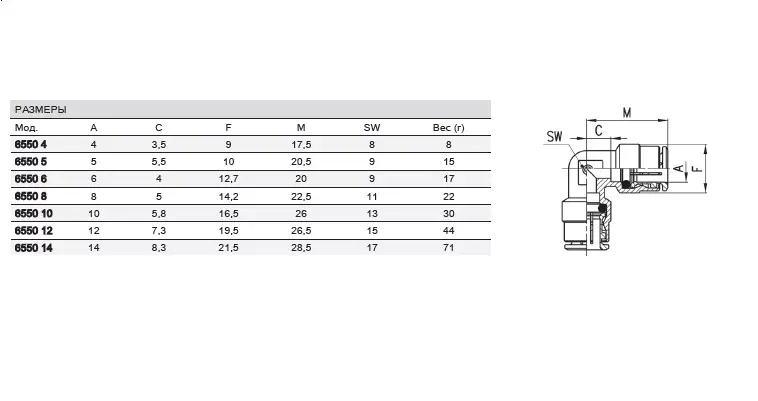 Штуцер цанговий кутовий з’єднувач CAMOZZI 6550.