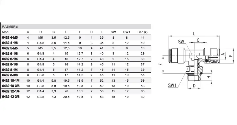 | Різьба | 1/8, 1/4, 3/8, 1/2, 3/4, М5, М6, М12х1,25 |