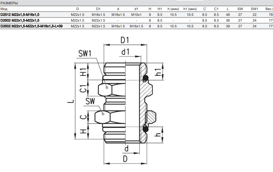 М10х1, М12х1,5, М14х1,5, М16х1,5, М18Х1,5, М22х1,5