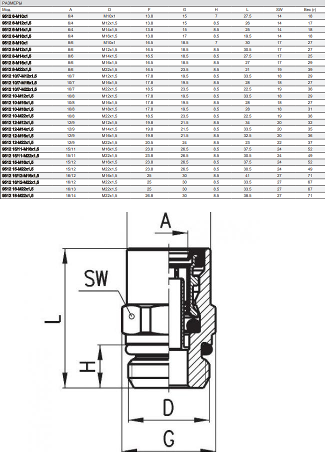 | Різьба мм | М10х1, М12х1,5, М14х1,5, М16х1,5, М18Х1,5, М22х1,5 |
