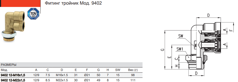 Фітинг трійник з зовнішнім метричним різьбленням CAMOZZI 9402