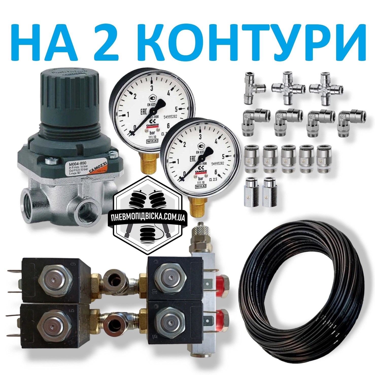 Цей комплект управління є найпопулярнішим серед користувачів пневмопідвіски у яких неровномірна загрузка. Управління через електроклапани дозволяє керувати кожною подушкою окремо.